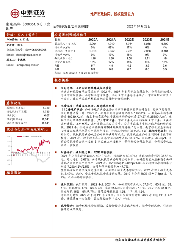 南京高科 市政业务 房地产 股权投资 财务分析