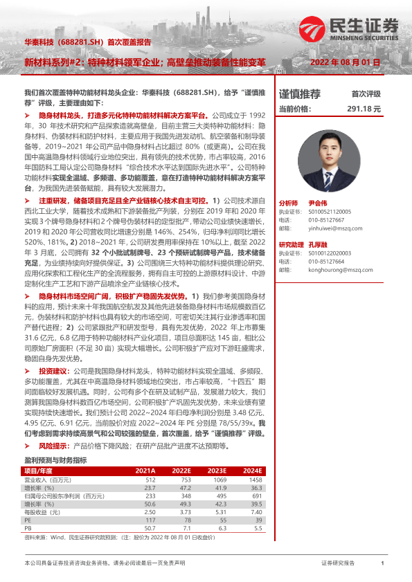 【民生证券】【20220801】20220801-民生证券-华秦科技-688281.SH-首次覆盖报告:新材料系列#2:特种材料领军企业;高壁垒推动装备性能变革-24页