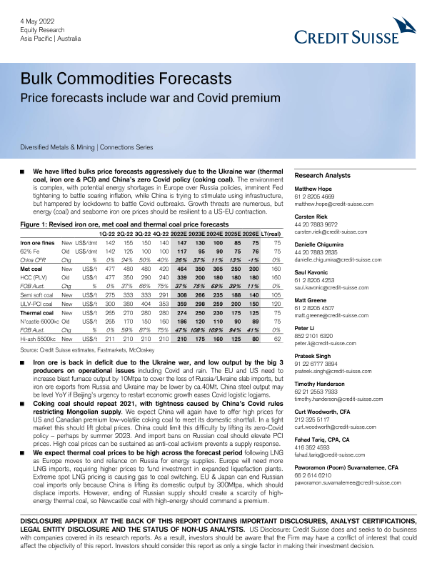 【瑞信(Credit Suisse)】【20220504】瑞信-亚太地区金属与采矿行业-大宗商品的预测:价格预测包括战争和新冠病毒溢价-51页