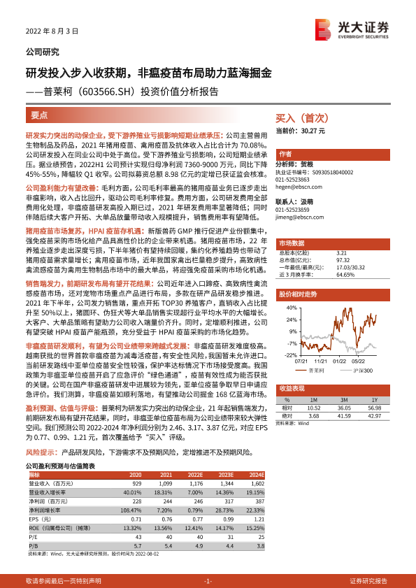 【光大证券】【20220803】研发投入步入收获期,非瘟疫苗布局助力蓝海掘金——普莱柯(603566.SH)投资价值分析报告-35页