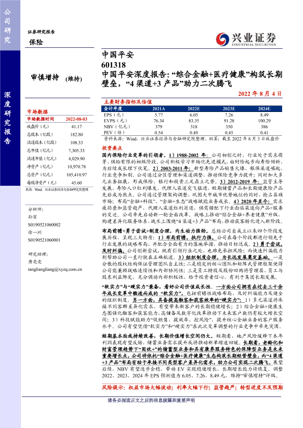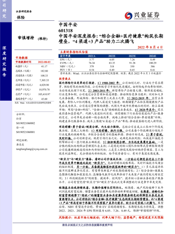 【兴业证券】【20220804】中国平安深度报告:“综合金融+医疗健康”构筑长期壁垒,“4渠道+3产品”助力二次腾飞-42页