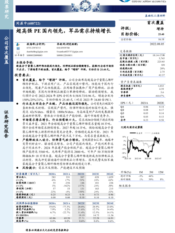 【国泰君安证券】【20220805】同益中-超高强PE国内领先,军品需求持续增长-28页