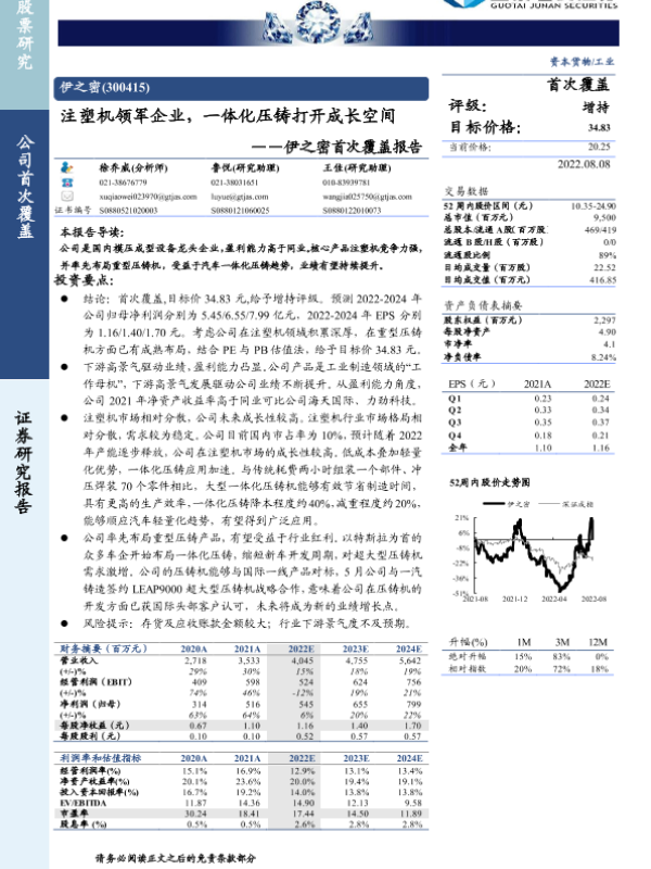【国泰君安证券】【20220808】伊之密首次覆盖报告:注塑机领军企业,一体化压铸打开成长空间-30页
