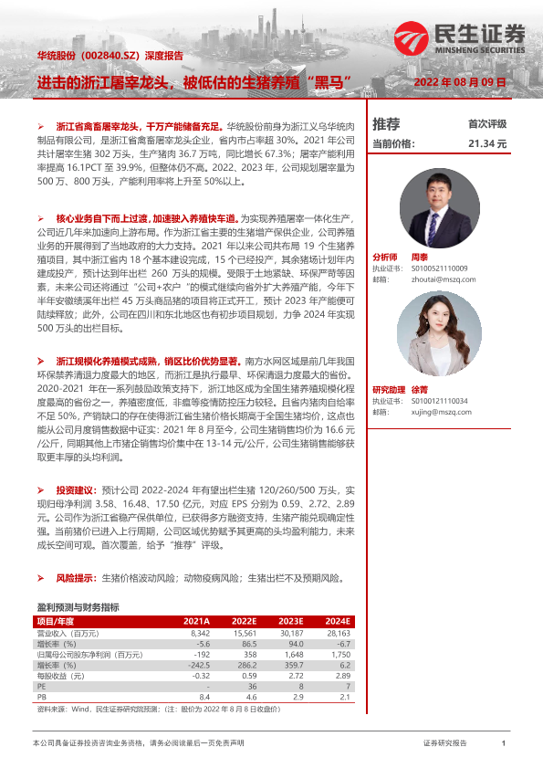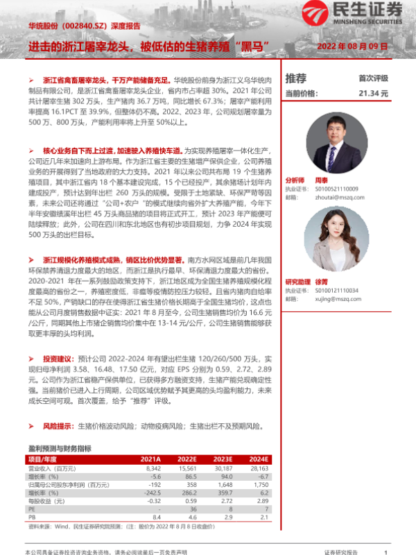 【民生证券】【20220809】20220809-民生证券-华统股份-002840.SZ-深度报告:进击的浙江屠宰龙头,被低估的生猪养殖“黑马”-22页