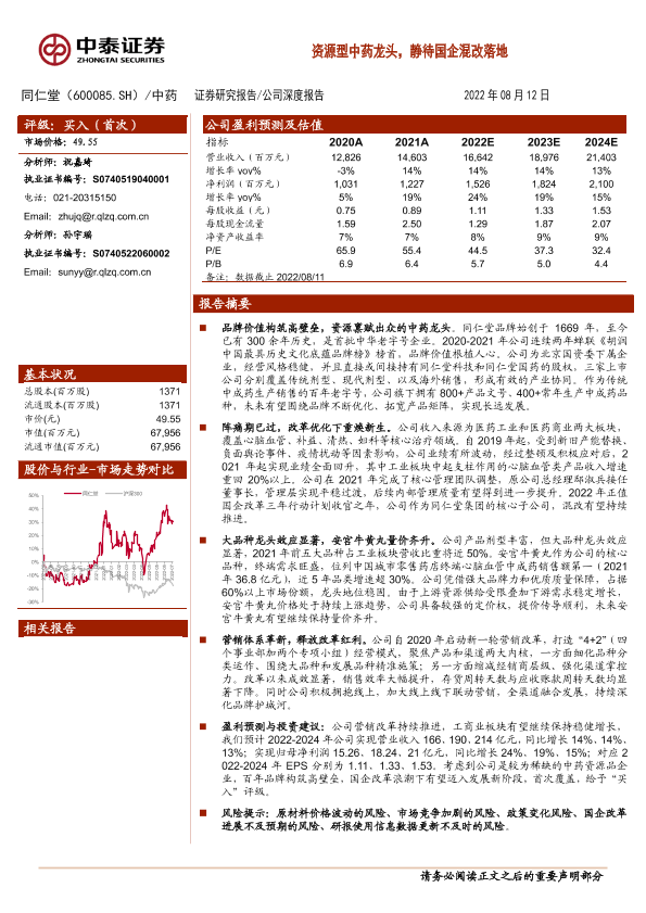 【中泰证券】【20220812】20220812-中泰证券-同仁堂-600085.SH-资源型中药龙头,静待国企混改落地-21页