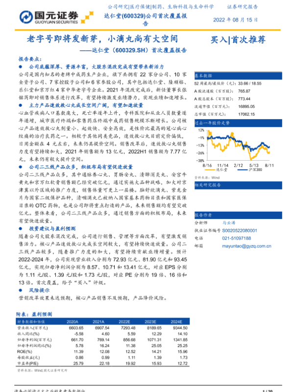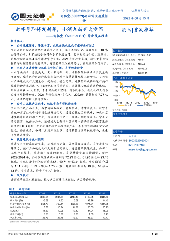 【国元证券】【20220815】老字号即将发新芽,小滴丸尚有大空间——达仁堂(600329.SH)首次覆盖报告-20页