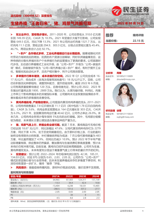【民生证券】【20220816】20220816-民生证券-温氏股份-300498.SZ-深度报告:生猪养殖“王者归来”,猪、鸡景气共振可期-24页