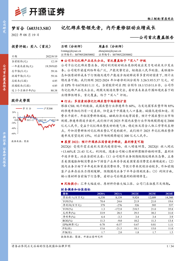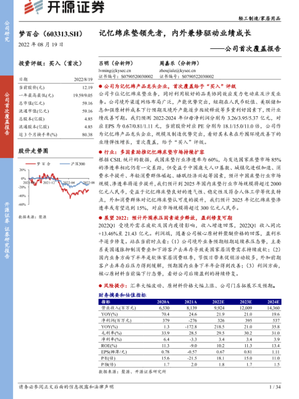 【开源证券】【20220819】公司首次覆盖报告:记忆绵床垫领先者,内外兼修驱动业绩成长-34页