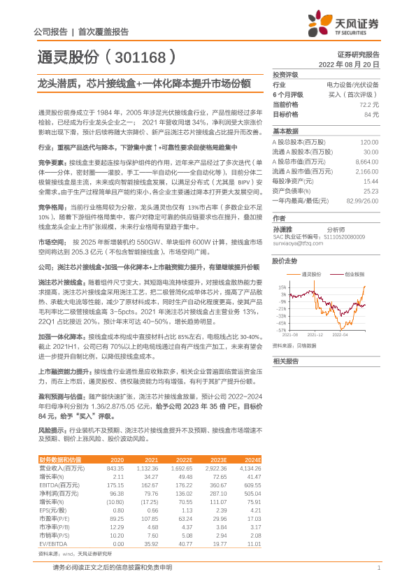 【天风证券】【20220820】通灵股份-龙头潜质,芯片接线盒+一体化降本提升市场份额-20页
