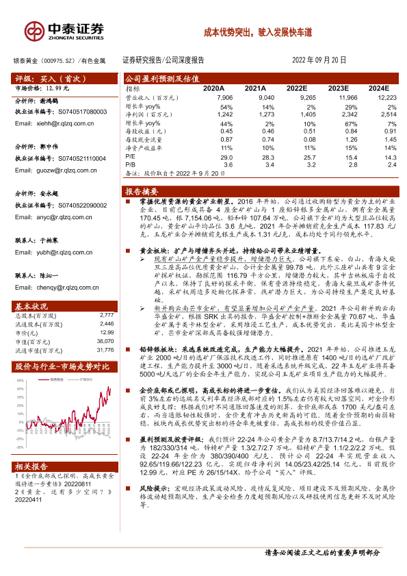 【中泰证券】【20220920】银泰黄金-成本优势突出,驶入发展快车道-30页