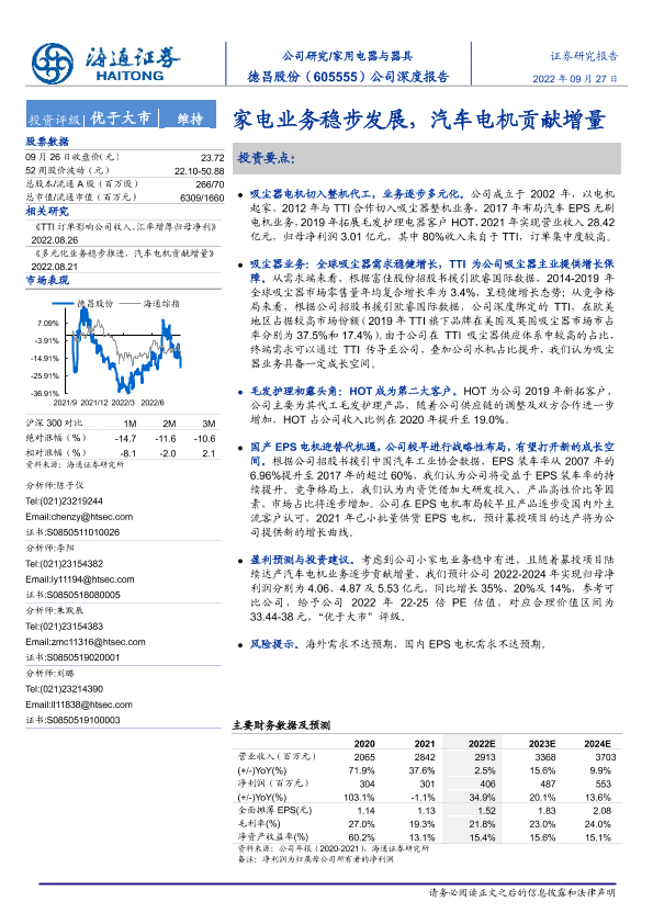 【海通证券】【20220927】20220927-海通证券-德昌股份-605555.SH-公司深度报告:家电业务稳步发展,汽车电机贡献增量-18页