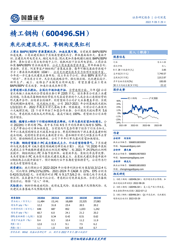 【国盛证券】【20220929】精工钢构(600496.SH):乘光伏建筑东风,享钢构发展红利-17页