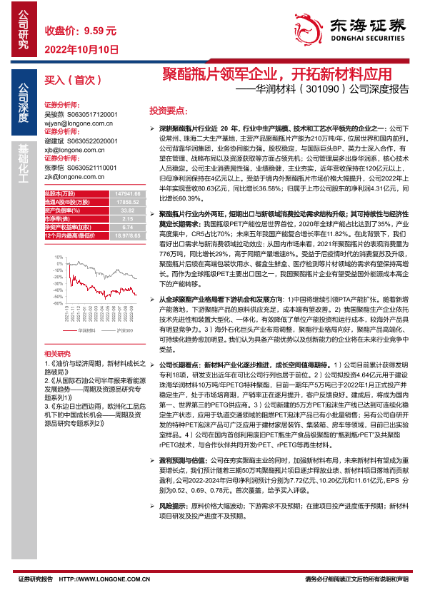 【东海证券】【20221010】聚酯瓶片领军企业,开拓新材料应用——华润材料(301090)公司深度报告-33页