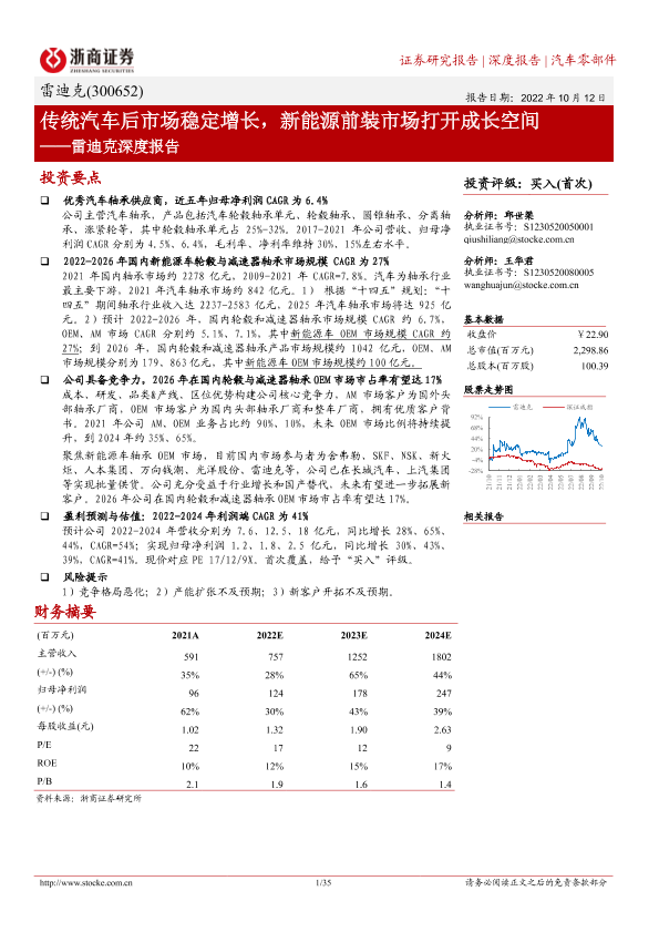 【浙商证券】【20221012】雷迪克深度报告:传统汽车后市场稳定增长,新能源前装市场打开成长空间-35页