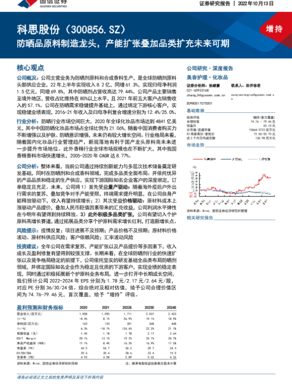 【国信证券】【20221013】科思股份-防晒品原料制造龙头,产能扩张叠加品类扩充未来可期-36页