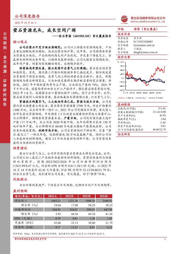 【东亚前海证券】【20221016】萤石资源龙头,成长空间广阔——金石资源(603505.SH)首次覆盖报告-43页