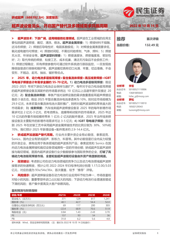 【民生证券】【20221016】骄成超声(688392.SH)深度报告:超声波设备龙头,开启国产替代及多领域需求共振周期-43页