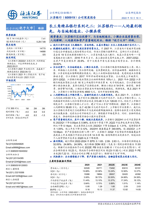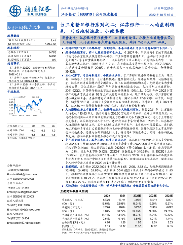 【海通证券】【20221016】20221016-海通证券-江苏银行-600919.SH-长三角精品银行系列之二:江苏银行——人均盈利领先,与当地制造业、小微共荣-20页