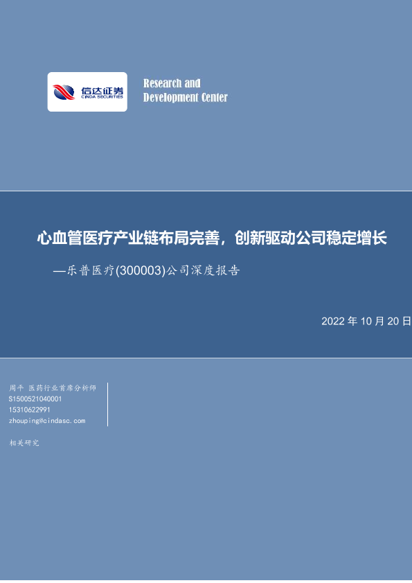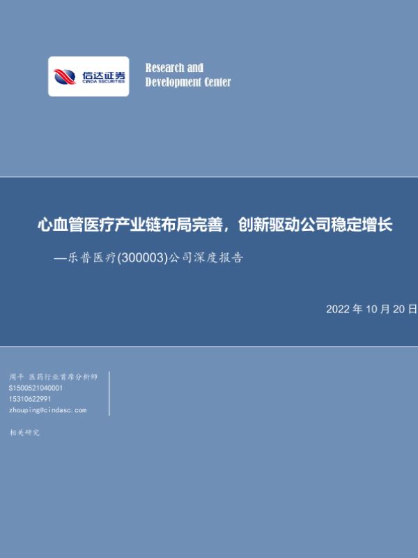 【信达证券】【20221020】20221020-信达证券-乐普医疗-300003.SZ-公司深度报告:心血管医疗产业链布局完善,创新驱动公司稳定增长-26页