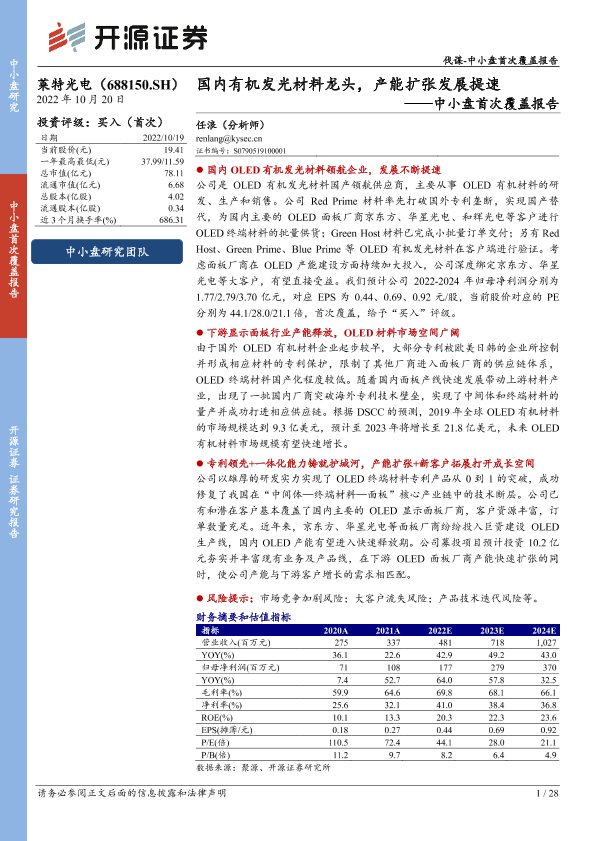【开源证券】【20221020】莱特光电-中小盘首次覆盖报告:国内有机发光材料龙头,产能扩张发展提速-28页