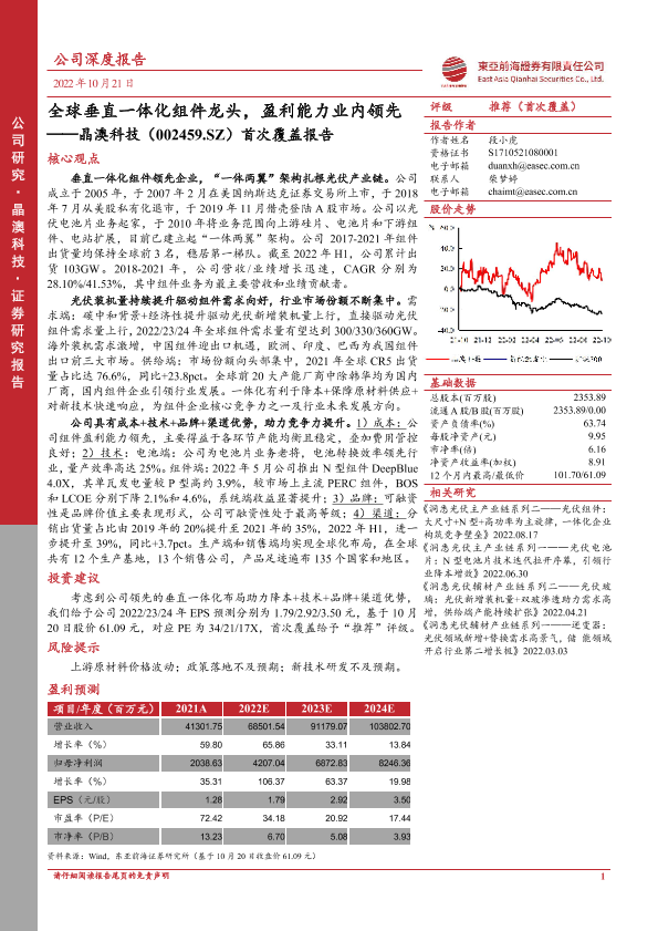 【东亚前海证券】【20221021】全球垂直一体化组件龙头,盈利能力业内领先——晶澳科技(002459.SZ)首次覆盖报告-34页