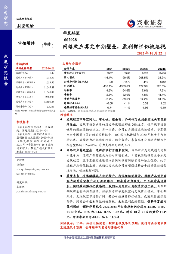 华夏航空 支线航空 盈利预测 网络效应 航空运输