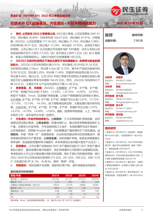 【民生证券】【20221024】紫金矿业-2022年三季度业绩点评:价跌本升Q3业绩承压,内生增长+外延并购持续发力-36页