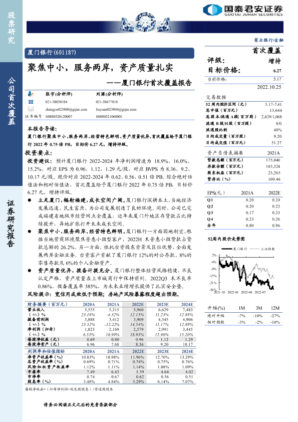 【国泰君安证券】【20221025】厦门银行首次覆盖报告:聚焦中小,服务两岸,资产质量扎实-24页