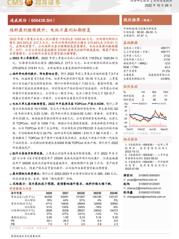 【海通证券】【20221026】通威股份-硅料盈利继续提升,电池片盈利如期修复-16页