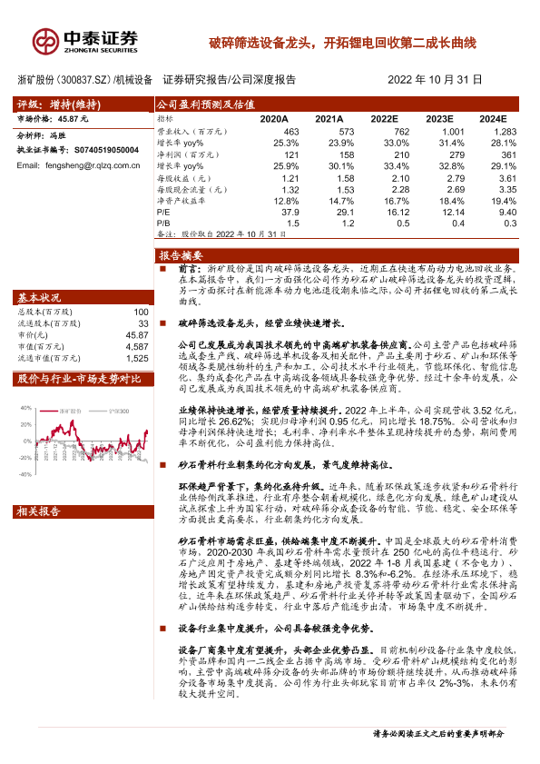【中泰证券】【20221031】20221031-中泰证券-浙矿股份-300837.SZ-破碎筛选设备龙头,开拓锂电回收第二成长曲线-30页