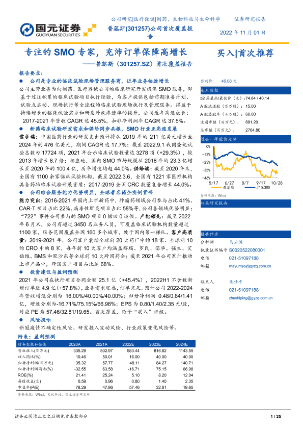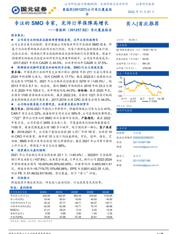【国元证券】【20221101】普蕊斯-301257.SZ-首次覆盖报告:专注的SMO专家,充沛订单保障高增长-25页