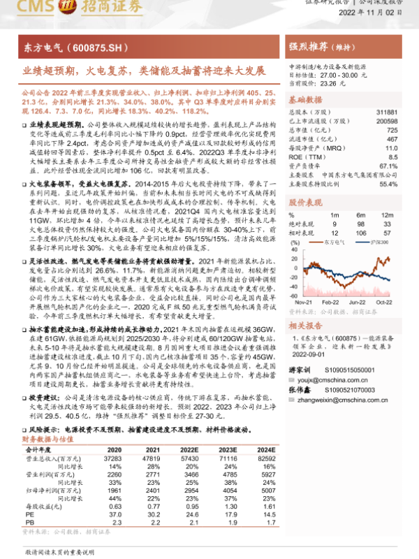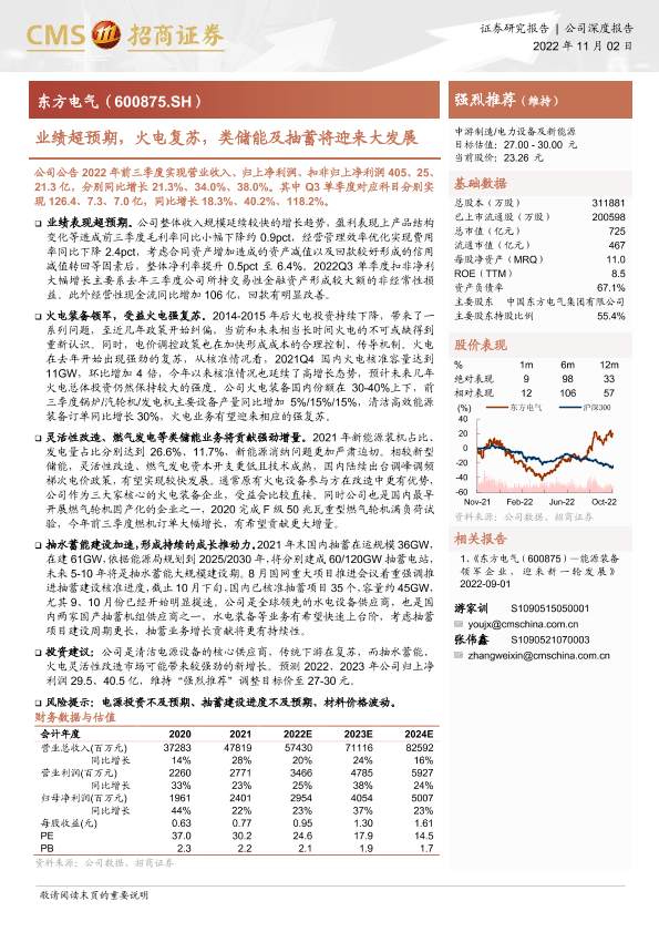 业绩超预期 东方电气 抽水蓄能 清洁能源 火电复苏