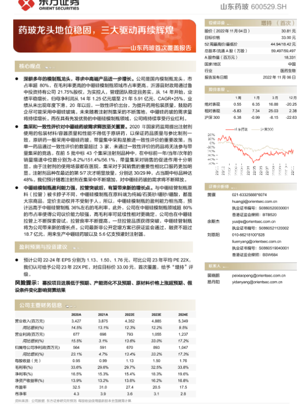【东方证券】【20221106】山东药玻首次覆盖报告:药玻龙头地位稳固,三大驱动再续辉煌-33页