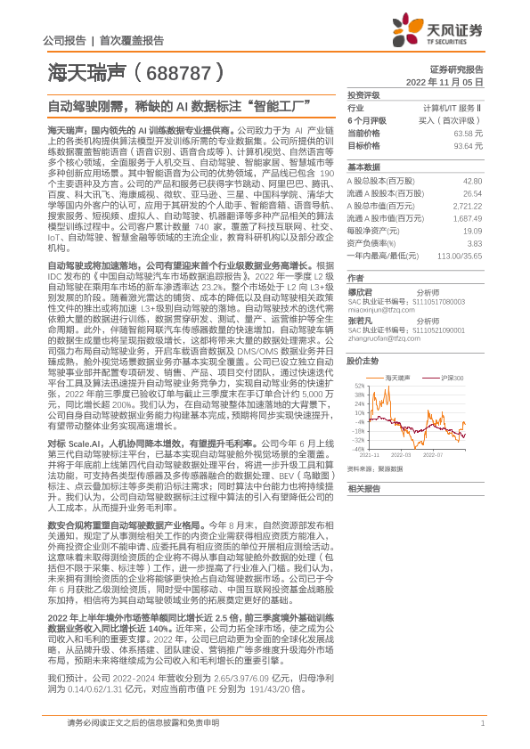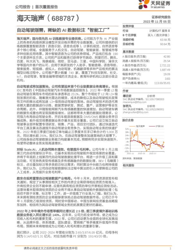 【天风证券】【20221105】20221105-天风证券-海天瑞声-688787.SH-自动驾驶刚需,稀缺的AI数据标注“智能工厂”-22页
