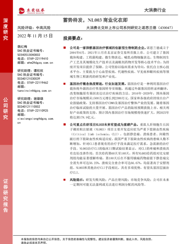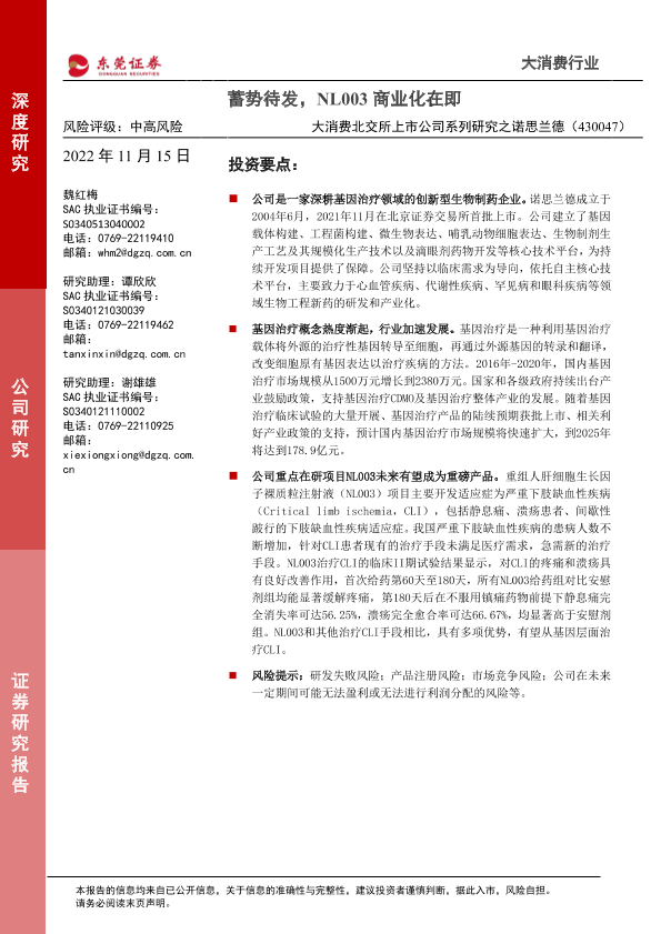 【东莞证券】【20221115】大消费北交所上市公司系列研究之诺思兰德:蓄势待发,NL003商业化在即-23页