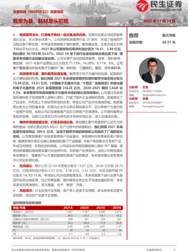 【民生证券】【20221114】洁美科技-002859.SZ-深度报告:载带为基,耗材龙头初现-28页