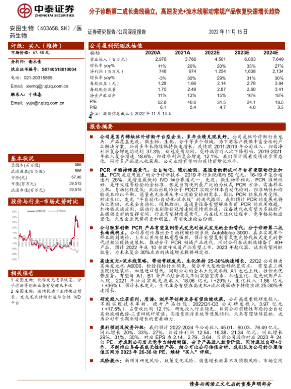 【中泰证券】【20221115】20221115-中泰证券-安图生物-603658.SH-分子诊断第二成长曲线确立,高速发光+流水线驱动常规产品恢复快速增长趋势-20页