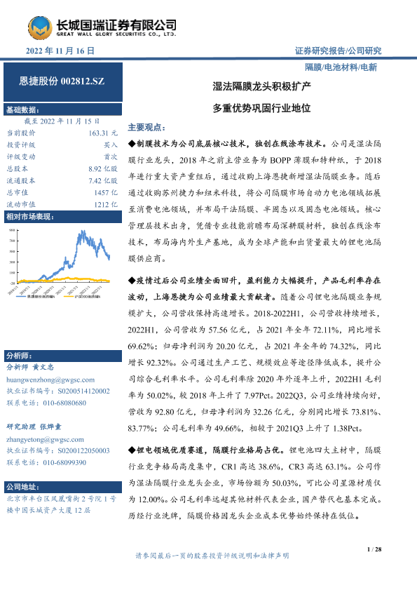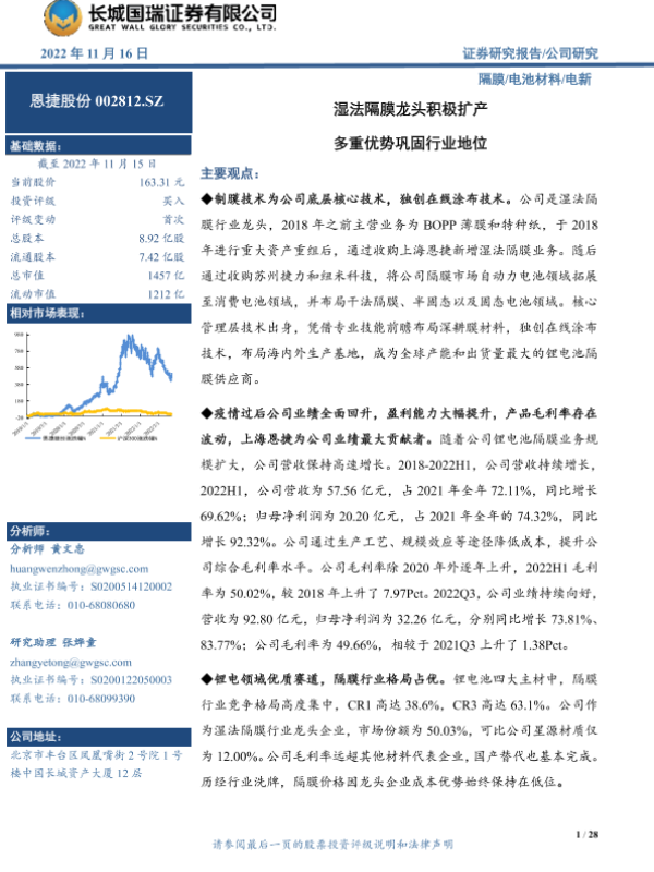 【长城国瑞证券】【20221116】湿法隔膜龙头积极扩产 多重优势巩固行业地位-28页