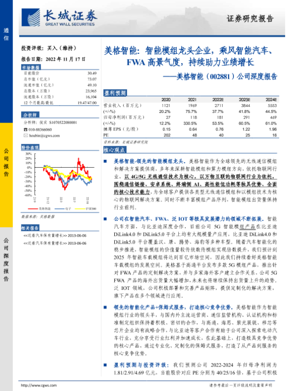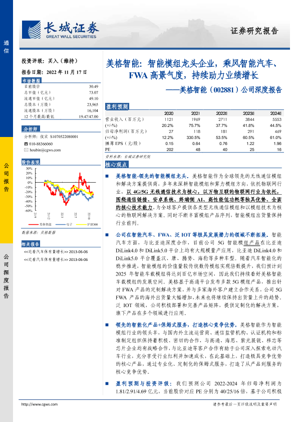 【长城证券】【20221117】20221117-长城证券-美格智能-002881.SZ-公司深度报告:智能模组龙头企业,乘风智能汽车、FWA高景气度,持续助力业绩增长-32页