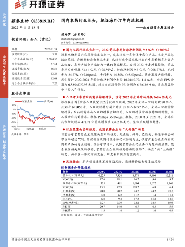 农药行业 北交所 海外订单内流 颖泰生物 首次覆盖报告