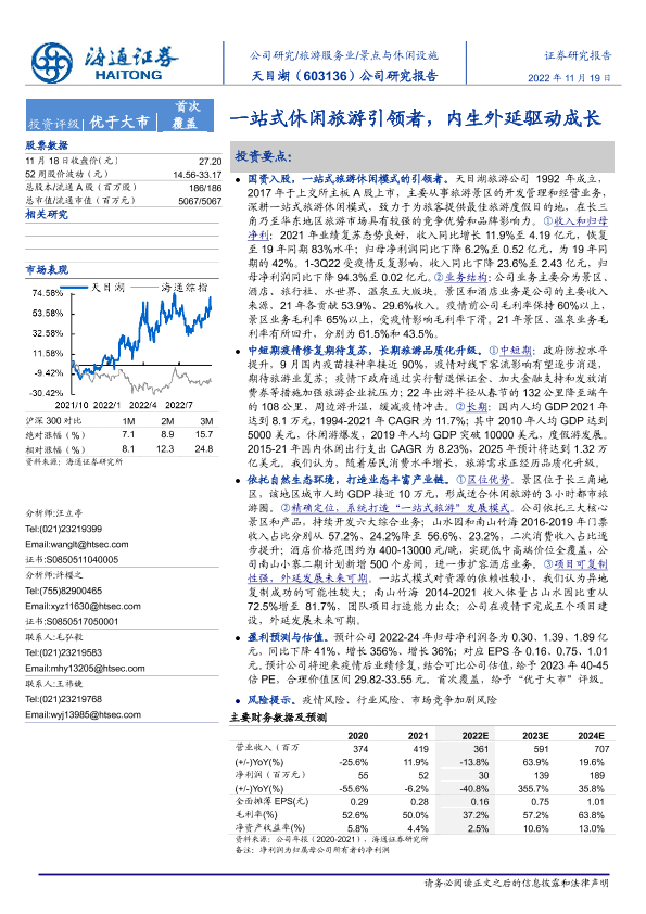 【海通证券】【20221119】20221119-海通证券-天目湖-603136.SH-公司研究报告:一站式休闲旅游引领者,内生外延驱动成长-27页