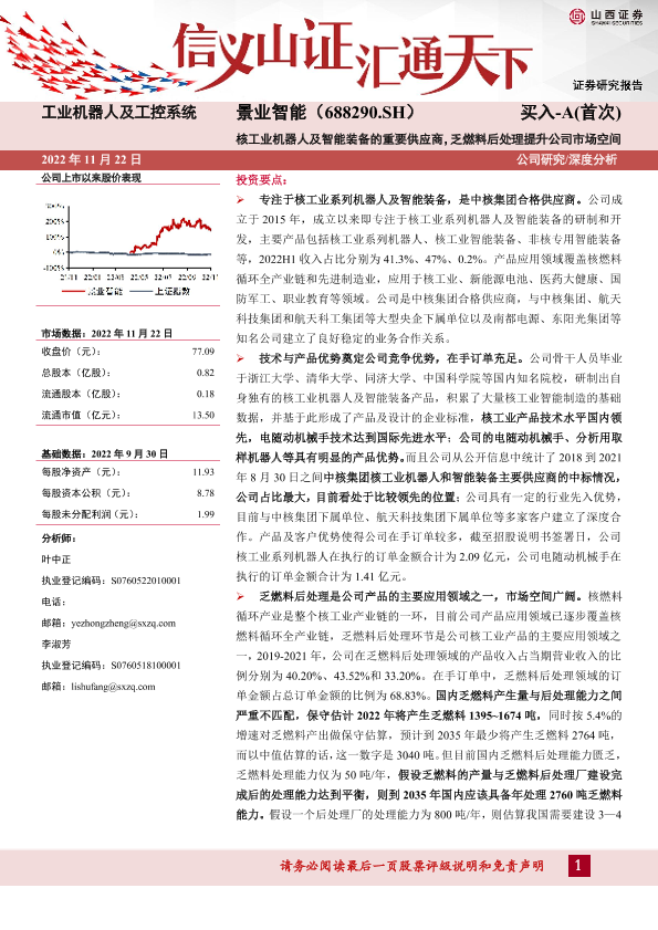 【山西证券】【20221122】景业智能-688290.SH-核工业机器人及智能装备的重要供应商,乏燃料后处理提升公司市场空间-20页