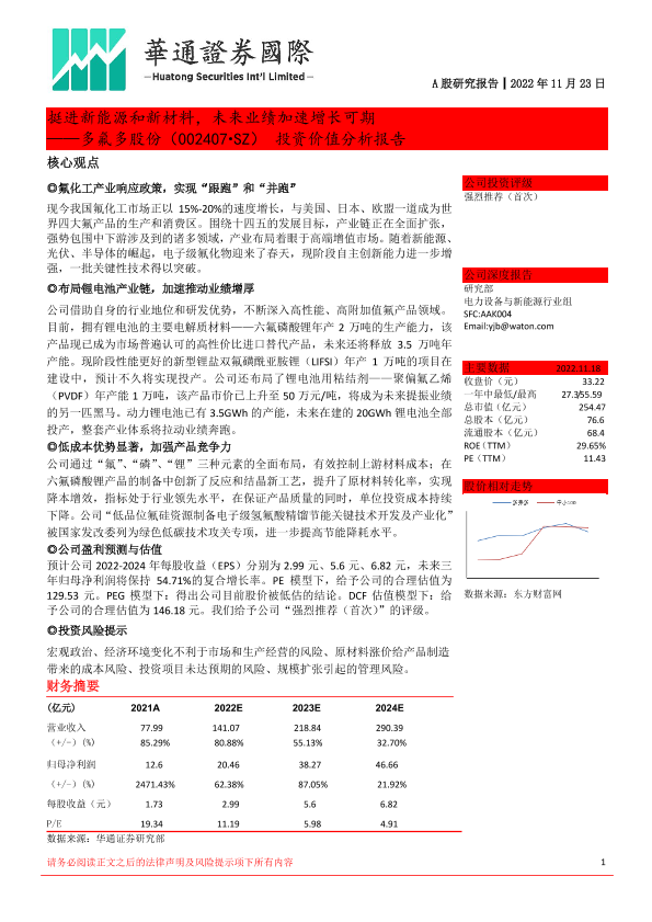 【华通证券国际】【20221123】挺进新能源和新材料,未来业绩加速增长可期 ——多氟多股份(002407SZ)投资价值分析报告-20页