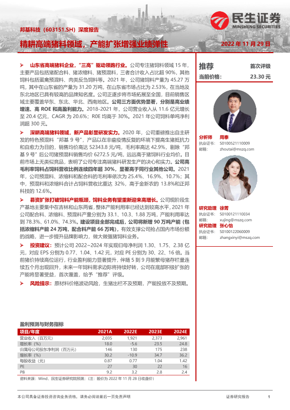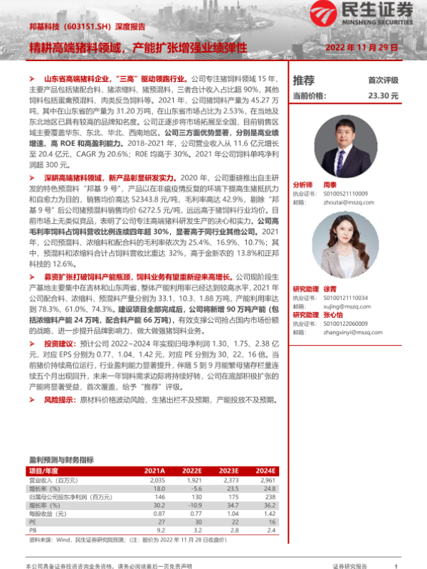 【民生证券】【20221129】20221129-民生证券-邦基科技-603151.SH-深度报告:精耕高端猪料领域,产能扩张增强业绩弹性-20页
