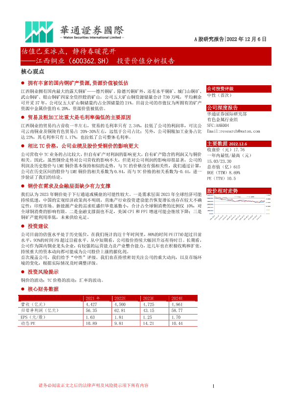 【华通证券国际】【20221206】20221206-华通证券国际-江西铜业-600362.SH-投资价值分析报告:估值已至冰点,静待春暖花开-18页