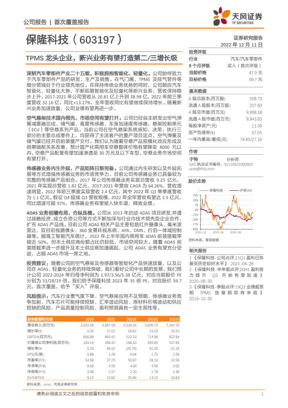 【天风证券】【20221211】保隆科技-603197.SH-TPMS龙头企业,新兴业务有望打造第二 三增长级-22页