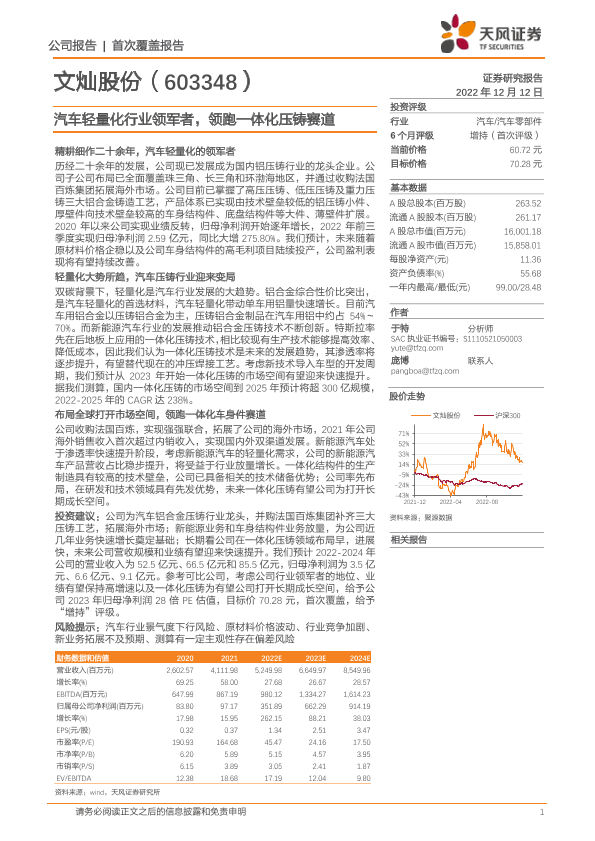 【天风证券】【20221212】文灿股份-603348.SH-汽车轻量化行业领军者,领跑一体化压铸赛道-26页