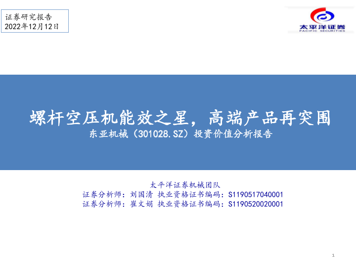 【太平洋证券】【20221212】20221212-太平洋-东亚机械-301028.SZ-投资价值分析报告:螺杆空压机能效之星,高端产品再突围-54页