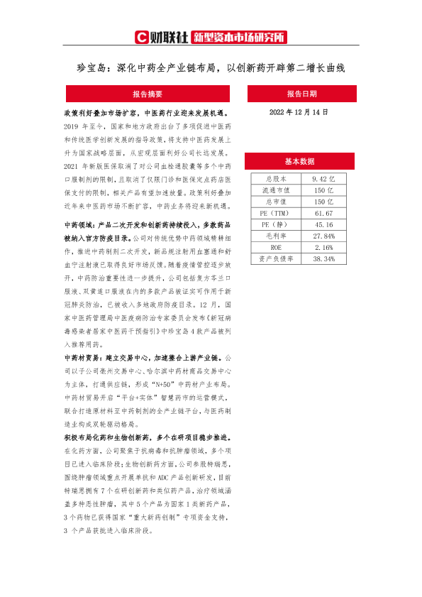 【财联社新型资本市场研究所】【20221214】珍宝岛:深化中药全产业链布局,以创新药开辟第二增长曲线-30页