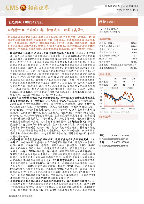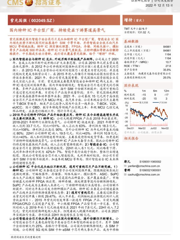FPGA 智能安全芯片 汽车MCU 特种IC 紫光国微